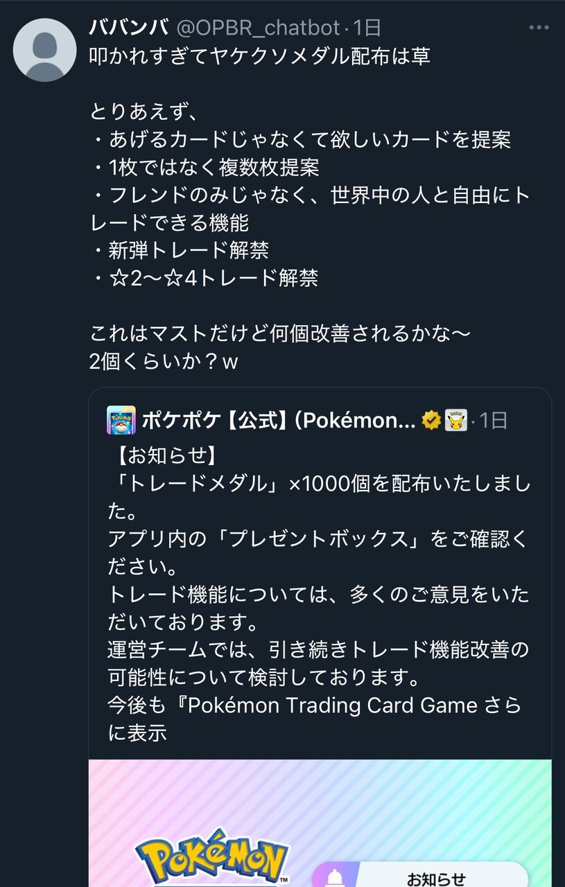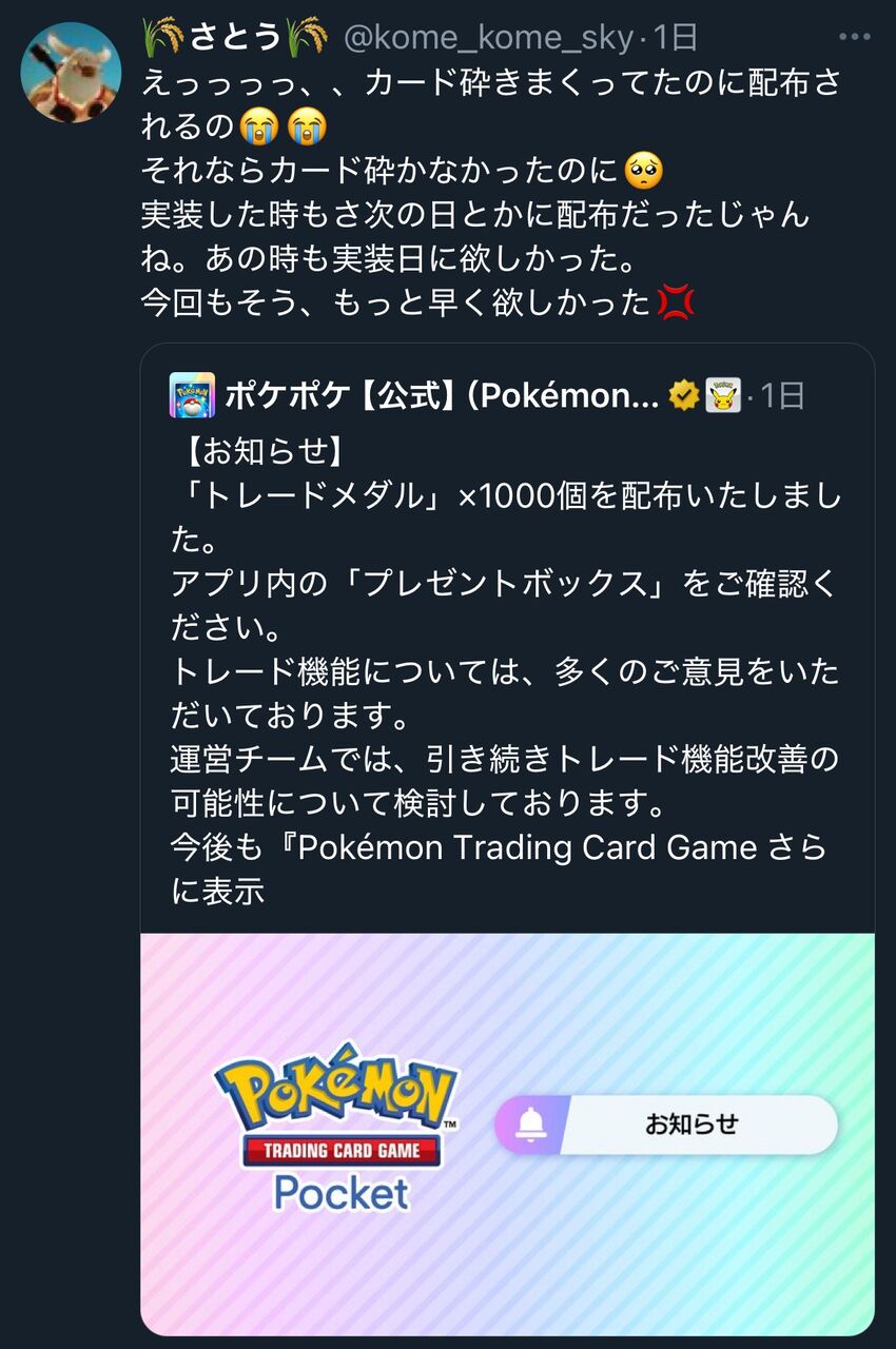 ポケポケのトレード機能がこんなにも多くのプレイヤーに不満を抱かせているとは驚きです。ポイントのばら撒きで一時的な改善を図ろうとしているのでしょうが、根本的な問題解決にはなっていないのが明らかですね。ユーザーの声が届くことを願っています。